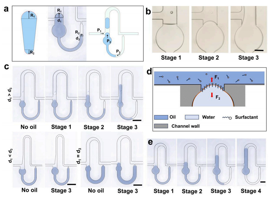 1、时序操作替代同步操控:先加载样本溶液至微结构捕获区,再注入油相,通过油-水界面曲率差异(ΔP=2γ(1/R2−1/R1))驱动水相自发迁移,仅需调控油相压力即可生成液滴;