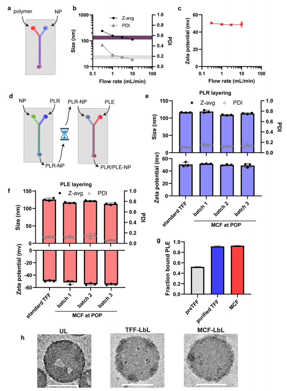 图 4. 微流控层层组装保持聚谷氨酸(PLE)/聚精氨酸(PLR)层层组装纳米颗粒所需的体外特性