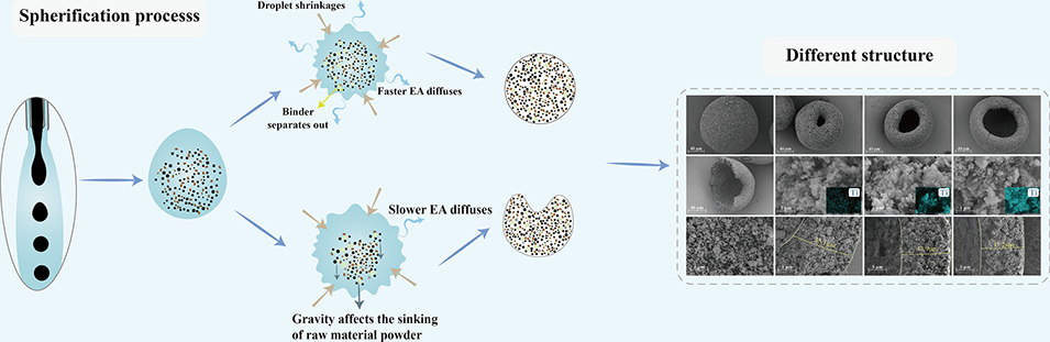 在溶剂持续扩散与粘结剂固化过程中,原料粉末(B、Ti、CuO)随粘结剂的析出逐渐紧密结合,最终形成具有特定结构的微球:无Ti时,B与CuO颗粒迁移速率快,乙酸乙酯扩散均匀,易形成球形微球;加入Ti后,因Ti密度高于B且增加分散相粘度,原料颗粒迁移速率减缓、自重沉降效应增强,微球顶部易塌陷形成碗状结构。最终定型的微球中,B、Ti、CuO颗粒均匀分布(为后续合金化反应提供接触基础),且内部因溶剂扩散留下多孔结构,既保障了原料混合均匀性,又为燃烧时的热量/质量传递创造条件。