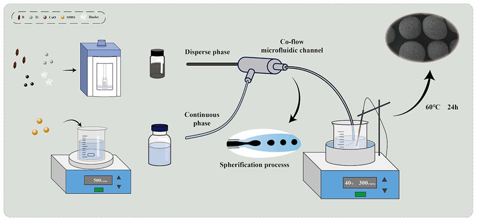 采用共流微流控通道结构,将含原料粉末的分散相(以乙酸乙酯为溶剂,溶解氟橡胶F₂₆₀₄、硝化棉NC作为复合粘结剂,同时加入B、Ti、CuO纳米粉末,经超声分散形成均匀悬浮液)与连续相(0.2%十二烷基苯磺酸钠SDBS水溶液,起稳定微滴作用)分别通过注射泵以恒定速率注入通道。在同心圆形通道的交汇处,连续相借助剪切力作用于分散相,打破分散相流体并使其形成尺寸均一的微小液滴,为后续自组装提供“微型反应容器”。