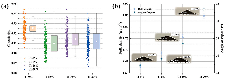 图 5:样品的圆形度、堆积密度与流动性分析图:(a)圆形度统计结果;(b)堆积密度与流动性(休止角)测试结果