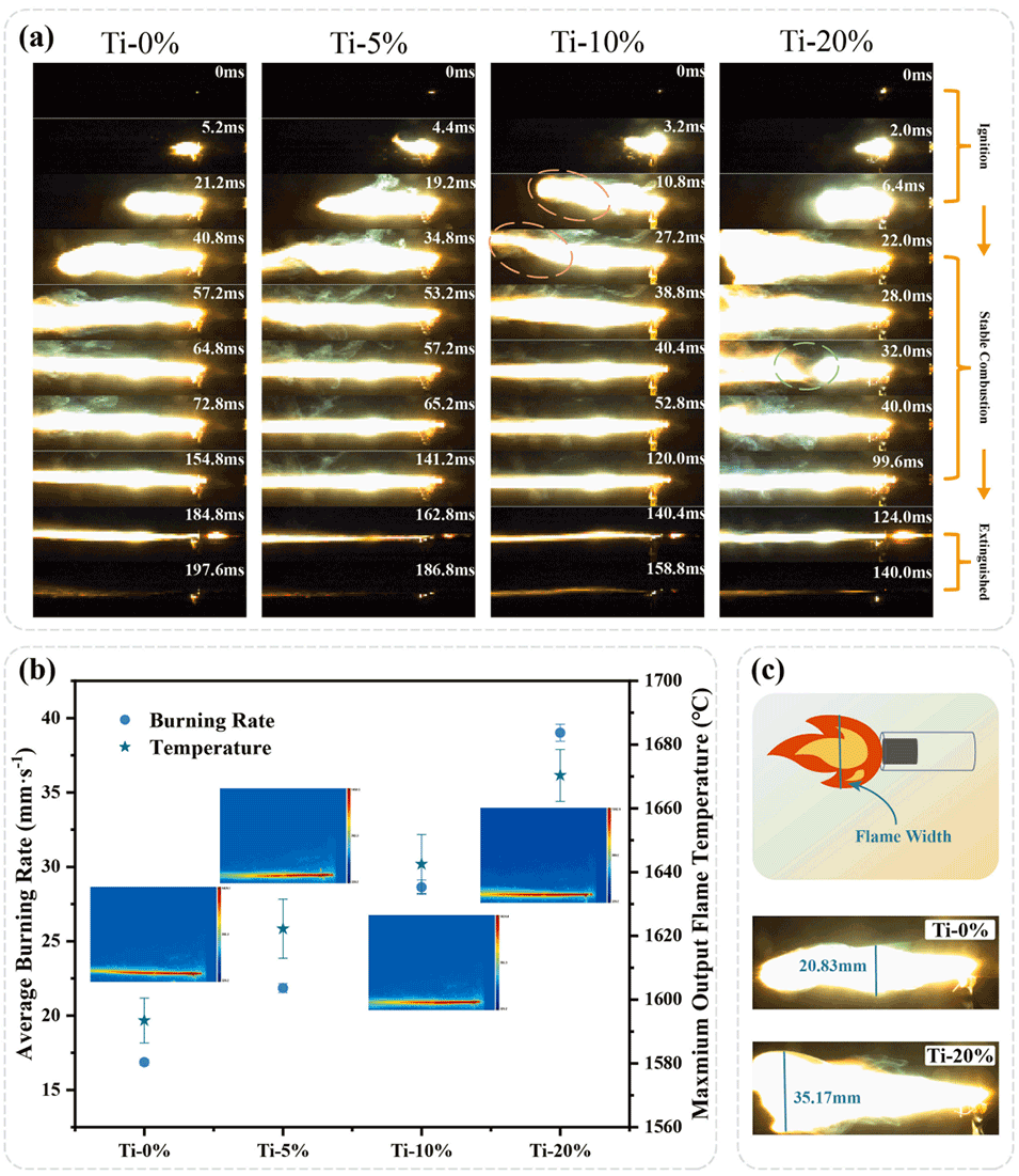 图 8:样品加压装药点火试验:(a)高速摄影记录的燃烧过程图像;(b)燃烧速率与火焰温度统计结果;(c)压装药柱的火焰宽度测量结果