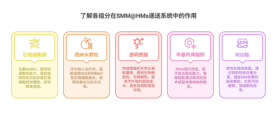近期,郑州大学第一附属医院研究团队开发出一种级联靶向水凝胶微球系统(SMM@HMs),该系统通过负载巨噬细胞膜包裹硒纳米颗粒的仿生纳米颗粒,实现关节内长效滞留、巨噬细胞精准靶向及活性氧清除,进而调控巨噬细胞极化并保护软骨细胞。相关研究以“Cascade-targeting hydrogel microspheres with biomimetic nanoparticles enable multifaceted anti-inflammatory and antioxidant defense for osteoarthritis management”为题目,发表在期刊《Chemical Engineering Journal》上。