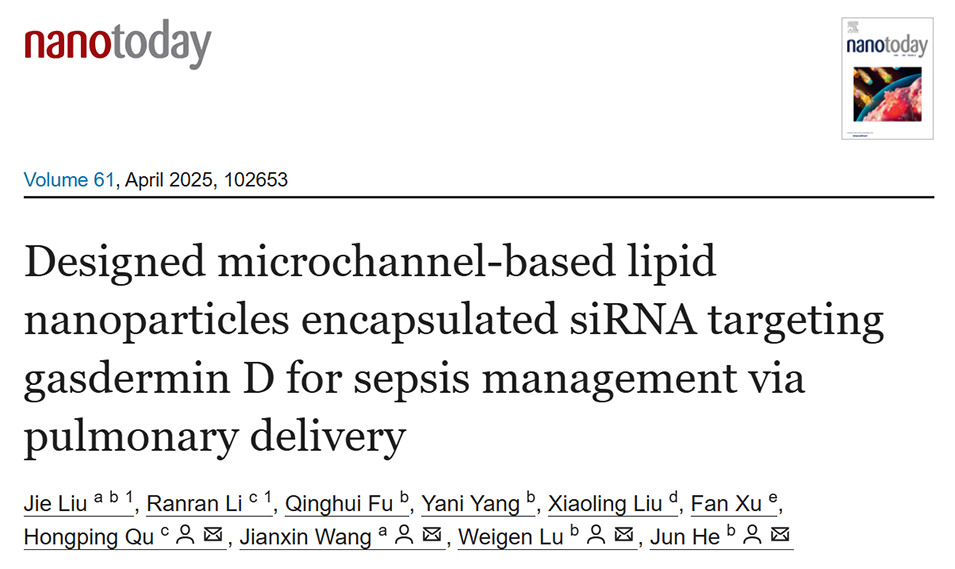 脓毒症是机体对感染反应失调引发的致命性疾病,目前缺乏有效治疗手段。研究表明,Gasdermin D(GSDMD)是脓毒症发生发展的关键执行者。基于此,复旦大学药学院王建新教授团队联合中国医药工业研究总院陆伟根副院长、何军研究员以及上海交通大学医学院附属瑞金医院瞿洪平教授团队,成功开发了一种基于环形非对称分割重组(CA/SAR)混合原理的新型微流控芯片(CA/SAR/C1),实现了靶向GSDMD的siRNA脂质纳米粒(siGSDMD-LNPs)的高效、连续化制备。通过肺部给药,该纳米制剂能高效沉默GSDMD蛋白表达,显著抑制细胞焦亡及全身炎症反应,在脓毒症模型小鼠中展现出良好的器官保护作用和生存率提升。相关研究以“Designed microchannel-based lipid nanoparticles encapsulated siRNA targeting gasdermin D for sepsis management via pulmonary delivery”为题目,发表在期刊《Nano Today》上。