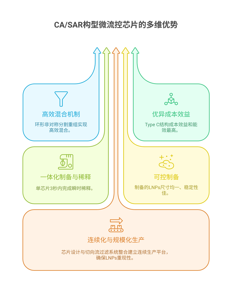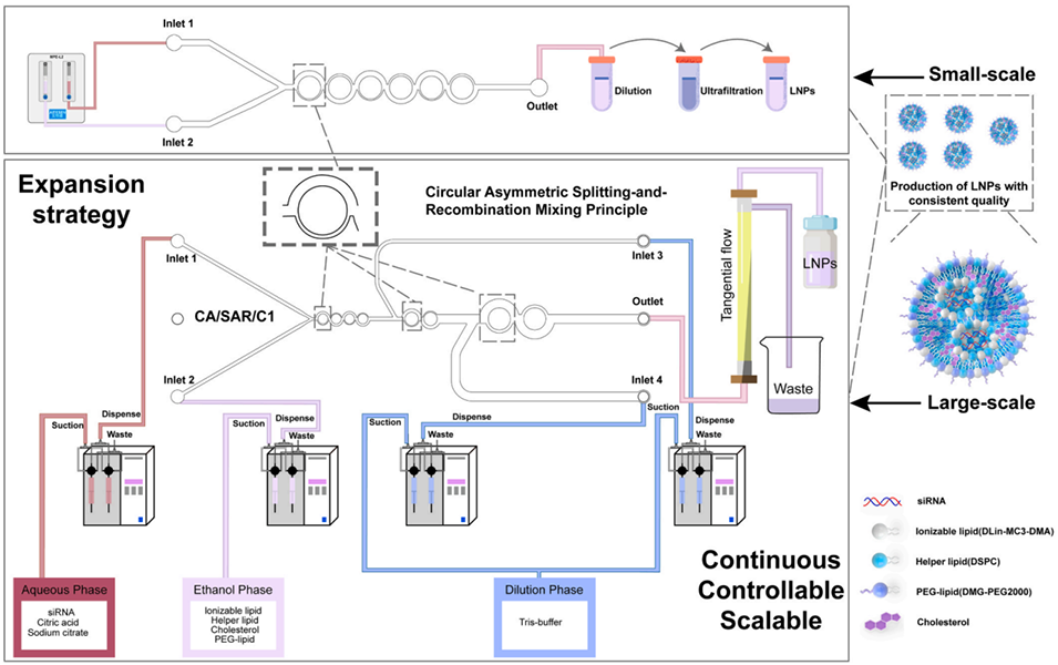 图 1:基于环形非对称分割重组(CA/SAR)混合原理,利用设计的 CA/SAR 微通道与 CA/SAR/C1 芯片实现高质量一致性脂质纳米颗粒(LNPs)制备的扩展策略图。