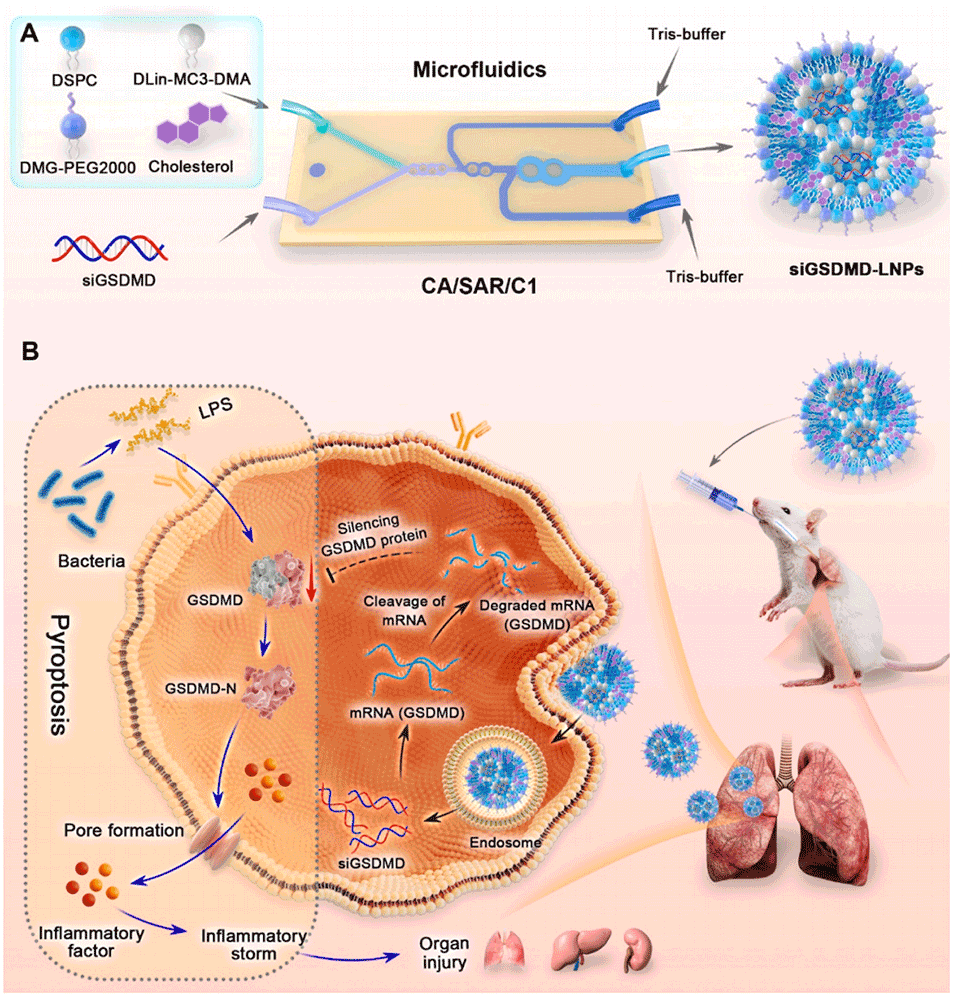 Scheme 1:siGSDMD-LNPs 的制备及其缓解脓毒症的作用机制示意图。(A)基于特定微通道的 siGSDMD-LNPs 制备过程;(B)siGSDMD-LNPs 缓解脓毒症的机制:通过 siRNA 沉默 GSDMD,进而减轻焦亡介导的炎症反应与器官损伤。