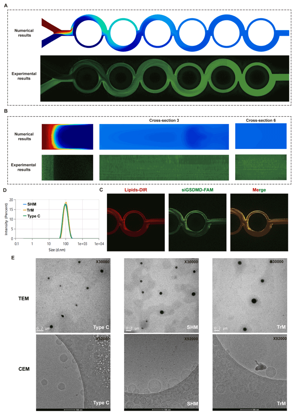 图 5:雷诺数 Re=660 时,C 型微通道内流体行为的数值模拟与实验验证对比。(A)基于乙醇-水两相体系(比例 1:3)的模拟流体行为与实际流体行为对比;(B)0 号、3 号、6 号横截面处界面混合性能的数值模拟结果与实验结果对比;(C)通过激光共聚焦显微镜(CLSM)观察 siGSDMD-LNPs 制备过程中第 6 次循环时的流体混合情况(脂质用 DIR 标记,siGSDMD 用 FAM 标记),表明在 LNPs 制备条件下,C 型微通道可实现两相流体的充分均匀混合(总流速 TFR 设为 6 mL/min,流率比 FRR 设为 3);(D)采用 C 型、交错人字形(SHM)、环形(TrM)微通道制备的最终 LNPs 的粒径对比;(E)采用 C 型、SHM、TrM 微通道制备的最终 LNPs 的形态对比。