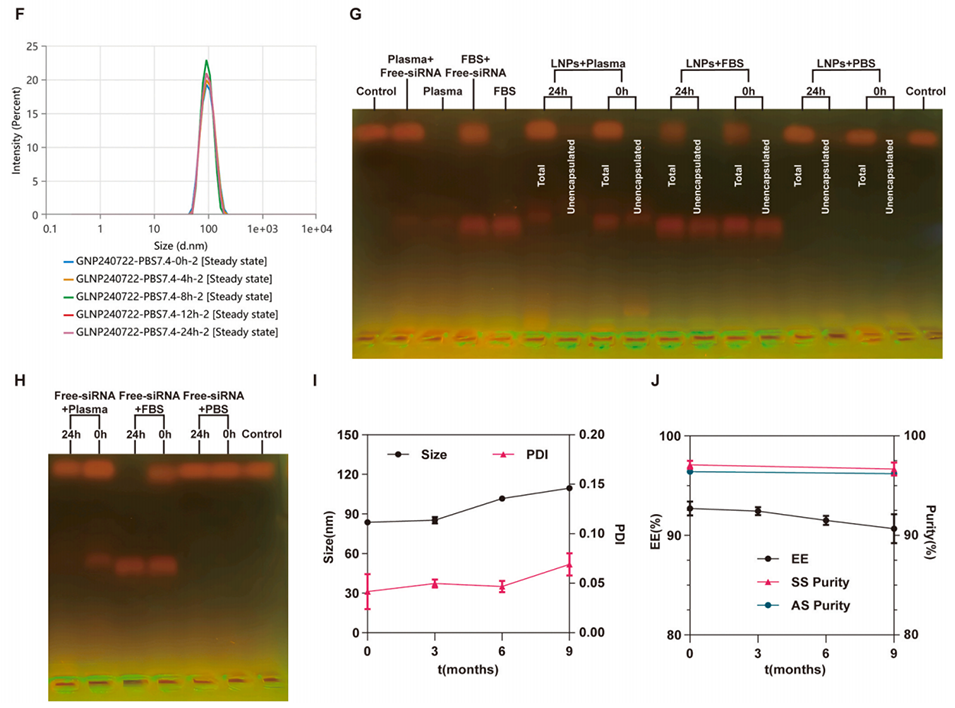 3、筛选出沉默效率最高的siGSDMD序列(#3),以DLin-MC3-DMA、DSPC等为脂质材料,通过CA/SAR/C1芯片一步制备siGSDMD-LNPs。这些颗粒粒径约94nm、PDI≈0.1,在PBS、血清中稳定性良好,4℃储存9个月理化性质无显著变化,且能保护siRNA免受降解。