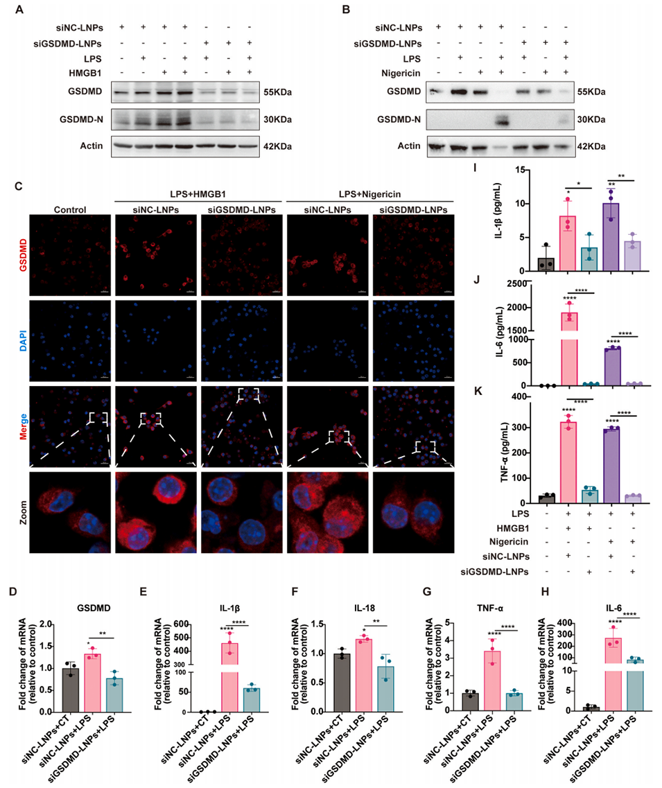 图 8:siGSDMD-LNPs 在骨髓来源巨噬细胞(BMDMs)中的体外药效学评价。(A、B)BMDMs 与 siGSDMD-LNPs 或阴性对照 LNPs(siNC-LNPs)共孵育 48 小时后诱导焦亡,通过蛋白质印迹法检测 GSDMD 与 GSDMD-N 的蛋白水平;(C)CLSM 图像显示 BMDMs 中 GSDMD 的表达与定位;(D-H)通过实时荧光定量聚合酶链反应(RT-qPCR)检测 GSDMD 及炎症因子的 mRNA 水平(n=3);(I-K)通过酶联免疫吸附试验(ELISA)检测经 siNC-LNPs 或 siGSDMD-LNPs 处理的 BMDMs 释放的促炎细胞因子水平(n=3)。