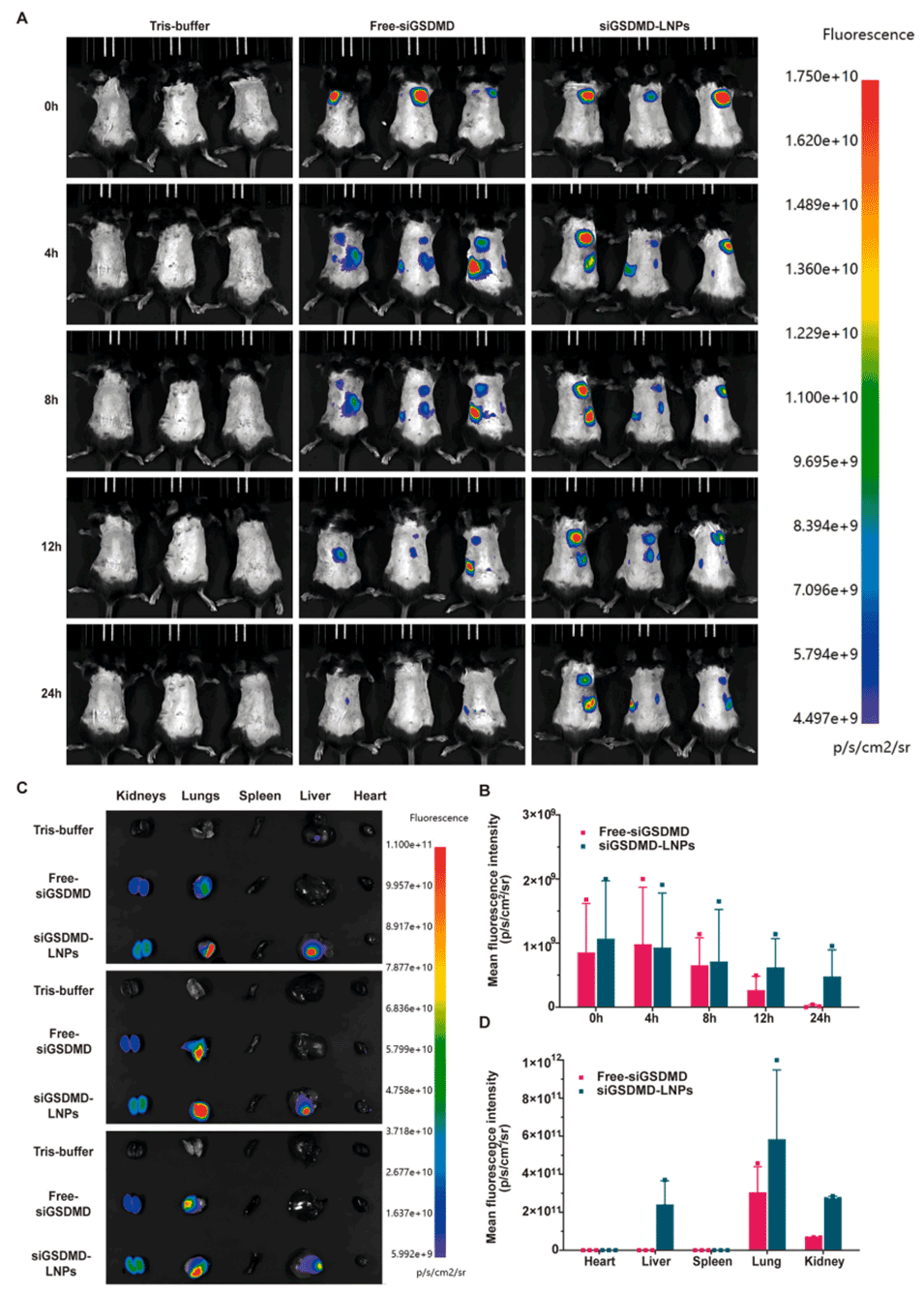 图 9:利用 AniView 100 活体成像系统观察 siGSDMD-LNPs 在小鼠体内的肺部靶向分布情况。(A, B)经肺内给药后,不同时间点 siGSDMD-LNPs(siGSDMD 用 CY5 标记)在小鼠体内的组织分布活体成像图(n=3);(C, D)肺内给药 24 小时后,小鼠离体器官(心、肝、脾、肺、肾)的成像图及荧光强度分析(n=3)。