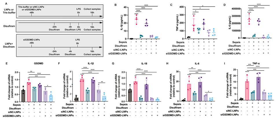 图 10:肺内给药 siGSDMD-LNPs 可减轻脓毒症小鼠的炎症反应与肺损伤。(A)体内药效学研究的给药方案;(B-D)通过 ELISA 检测经 siGSDMD-LNPs 或双硫仑(disulfiram)处理的脓毒症小鼠血浆中炎症因子水平(n=4);(E-I)通过 RT-qPCR 检测脓毒症小鼠肺组织中 GSDMD 及炎症因子的 mRNA 表达水平(n=4);(J)肺组织中 GSDMD 与巨噬细胞标志物 F4/80 的免疫荧光染色图;(K-L)通过蛋白质印迹法检测肺组织中 GSDMD 与 GSDMD-N 的蛋白表达水平;(M)经 siGSDMD-LNPs 或双硫仑处理的脓毒症小鼠肺组织苏木精-伊红(H&E)染色图;(N)经致死剂量脂多糖(LPS,50 mg/kg)诱导的脓毒症小鼠,在接受 siGSDMD-LNPs 或双硫仑治疗后的生存率曲线。