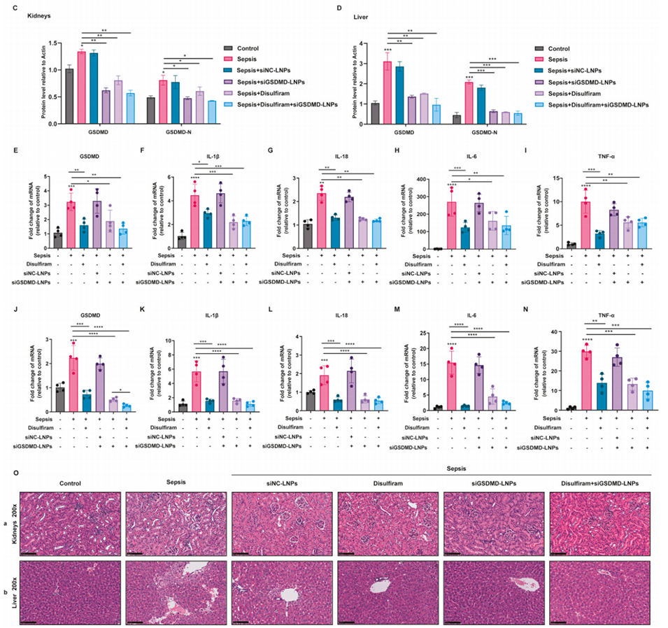 图 11:肺内给药 siGSDMD-LNPs 通过下调 GSDMD 表达抑制脓毒症相关的肾损伤与肝损伤。(A-D)通过蛋白质印迹法分析肾组织与肝组织中 GSDMD 与 GSDMD-N 的蛋白水平;(E-N)通过 RT-qPCR 检测肾组织(E-I)与肝组织(J-N)中 GSDMD 及炎症因子的 mRNA 表达水平(n=4);(O)经 siGSDMD-LNPs 或双硫仑处理的脓毒症小鼠肾组织与肝组织的 H&E 染色图。