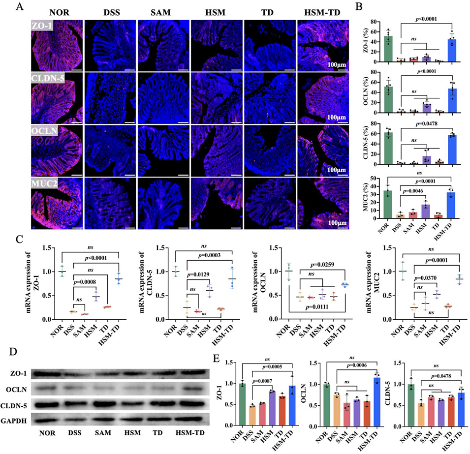 图9. HSM-TD修复肠上皮屏障并恢复黏液分泌。通过免疫荧光染色、qPCR和Western blot实验,证实HSM-TD能上调结肠炎小鼠肠上皮紧密连接蛋白(ZO-1、CLDN-5、OCLN)和黏液蛋白(MUC2)的表达,恢复肠上皮连续性和黏液屏障功能。