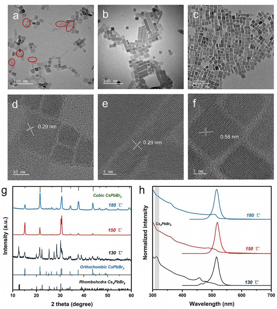 图2. 不同温度下流动化学法合成钙钛矿纳米晶的形貌、晶格结构及光学性能表征。a, d)130°C、b, e)150°C、c, f)180°C条件下(相同停留时间)合成的CsPbBr₃纳米晶的透射电子显微镜(TEM)图像及高分辨透射电子显微镜(HR-TEM)图像;g)不同反应温度下合成的钙钛矿纳米晶滴铸膜的X射线衍射(XRD)图谱;h)不同反应温度下获得的CsPbBr₃纳米晶的紫外-可见(UV/vis)吸收光谱与光致发光(PL)光谱。