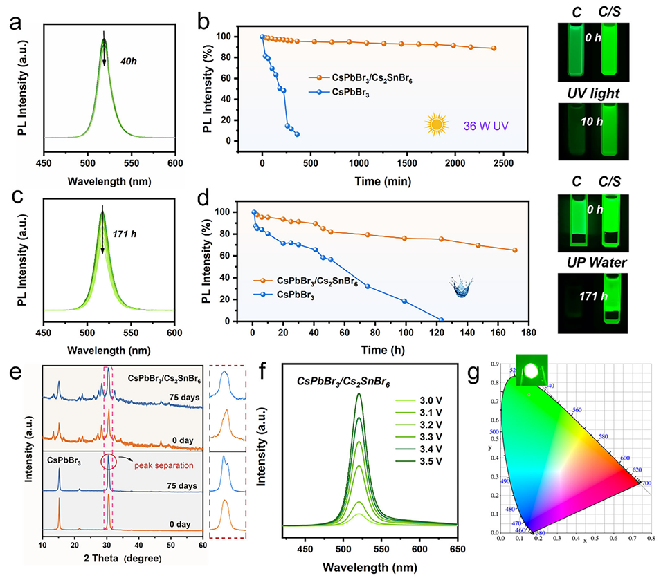 图6. 钙钛矿纳米晶的紫外光照稳定性、湿度稳定性、温度稳定性及器件性能分析。a)CsPbBr₃/Cs₂SnBr₆核壳结构纳米晶在恒定紫外光(365 nm,36 W)下的光稳定性;b)CsPbBr₃与CsPbBr₃/Cs₂SnBr₆核壳结构纳米晶的相对PL强度随紫外照射时间的变化对比;c)添加体积分数为40%的去离子水后,CsPbBr₃/Cs₂SnBr₆核壳结构纳米晶的水稳定性;d)水稳定性测试中CsPbBr₃与CsPbBr₃/Cs₂SnBr₆核壳结构纳米晶的相对PL强度变化对比;e)CsPbBr₃与CsPbBr₃/Cs₂SnBr₆纳米晶薄膜在室内开放环境中放置75天的XRD图谱;f)不同电压下CsPbBr₃/Cs₂SnBr₆发光二极管(LED)的电致发光(EL)光谱;g)CsPbBr₃/Cs₂SnBr₆ LED器件的1931国际照明委员会(CIE)色度图及其EL发光照片。