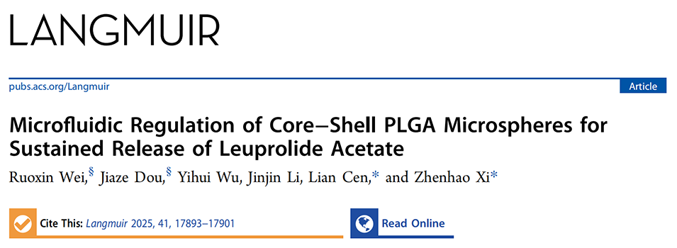 近期,华东理工大学奚桢浩教授、岑莲教授等人借助玻璃毛细管微流控装置构建水包油包水(W/O/W)乳液体系,成功制备出具有核壳结构的载醋酸亮丙瑞林(LA)聚乳酸-羟基乙酸共聚物(PLGA)微球,并系统探究了内水相明胶浓度、收集液pH值及LA浓度对微球包封率、载药量与体外释放性能的影响。相关研究以“Microfluidic Regulation of Core–Shell PLGA Microspheres for Sustained Release of Leuprolide Acetate”为题目,发表在期刊《Langmuir》上。