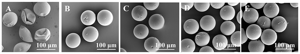 图6. 不同明胶浓度制备微球的SEM图像。(A)明胶浓度0 mg/mL;(B)明胶浓度2.5 mg/mL;(C)明胶浓度5 mg/mL;(D)明胶浓度7.5 mg/mL;(E)明胶浓度10 mg/mL
