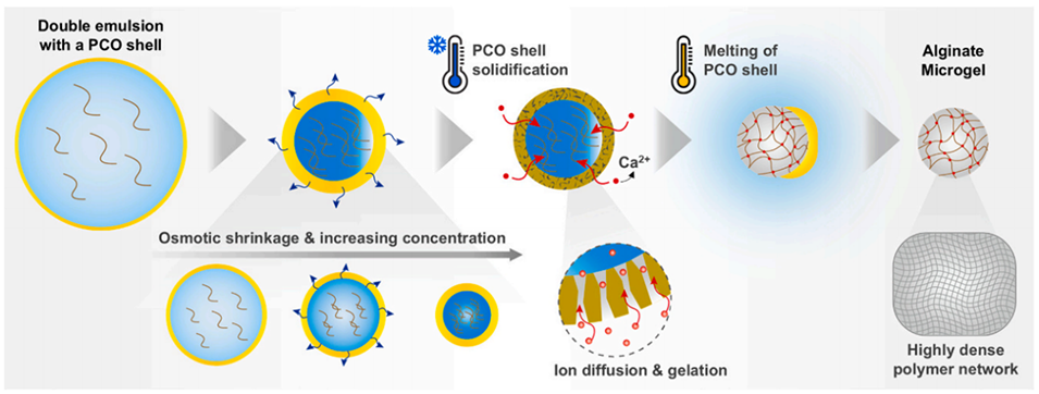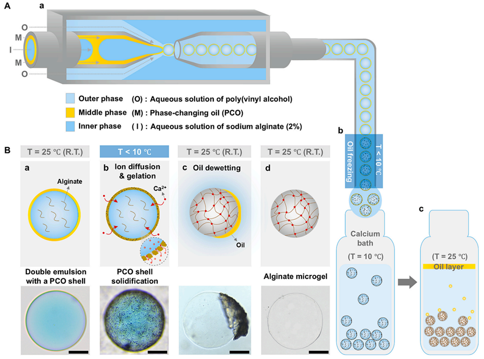 图1. 利用含相变油(PCO)壳的双乳液通过微流控技术制备海藻酸盐微凝胶。