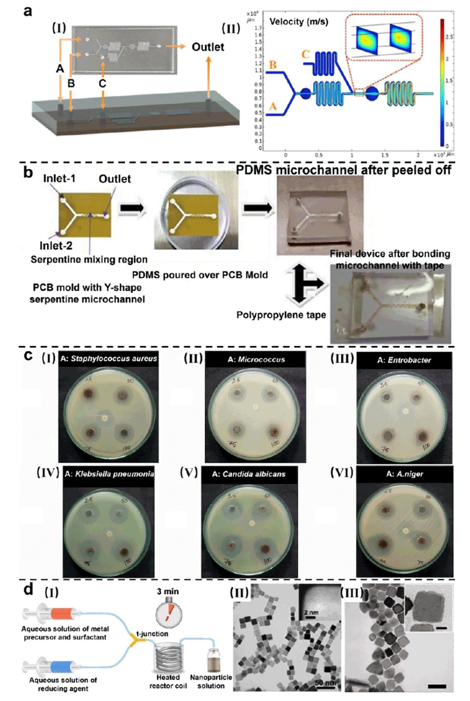 图 2(a)微流控合成银纳米颗粒:(I)微通道结构模型细节图;(II)微通道内溶液流速模拟图;(b)基于印刷电路板(PCB)的蛇形微混合器制备方法;(c)“A” 样品对多种菌的抑菌实验:(I)金黄色葡萄球菌、(II)藤黄微球菌、(III)粪肠球菌、(IV)肺炎克雷伯菌、(V)白色念珠菌、(VI)黑曲霉;(d)(I)微流控反应器合成纳米颗粒示意图;微流控合成纳米颗粒的透射电子显微镜(TEM)图:(II)钯纳米颗粒、(III)钯铂核壳纳米颗粒
