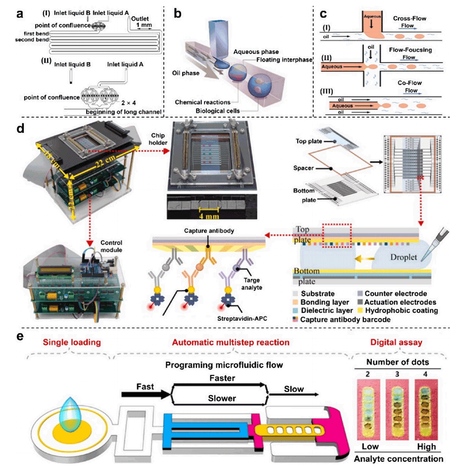 图 1(a)基于流动分层原理的层流微混合器(I)与三维扭曲流通道(II)示意图;(b)不互溶流体间的浮动界面;(c)液滴微流控装置生成的三种不同几何形态液滴:交叉流(I)、流动聚焦(II)与共流(III);(d)用于多通道免疫分析的数字微流控平台;(e)单片三维纸基微流控器件