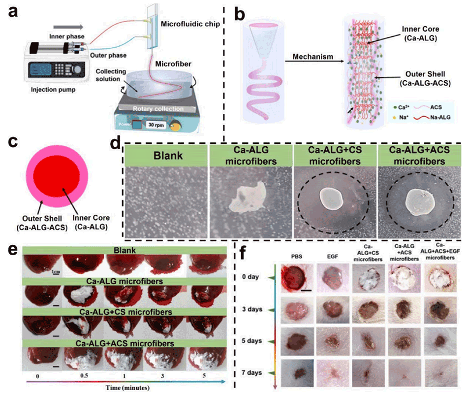 图 7(a)基于微流控平台的核壳微纤维合成过程;(b, c)核壳微纤维合成细节图;(d)不同样品对金黄色葡萄球菌(S. aureus)的抑菌效果;(e)肝脏止血实验中的出血与止血情况;(f)皮肤伤口实验结果
