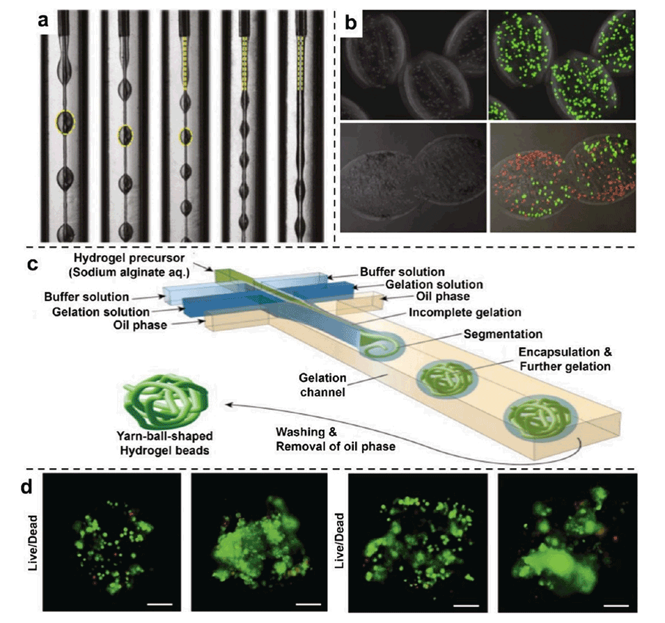图 8(a)微流控合成过程实时监测示意图;(b)单室与双室大孔微载体的光学图像与荧光图像;(c)纱球状水凝胶微球合成示意图;(d)利用纱球状水凝胶微球进行细胞培养: hela 细胞包埋于水凝胶基质中,活细胞与死细胞分别被染为绿色与红色