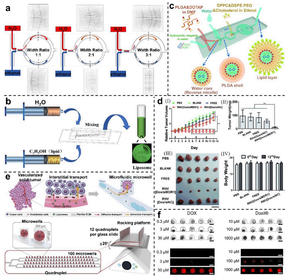图 11(a)微混合器中乙醇与水的流动状态及二次流;(b)脂质体制备示意图;(c)基于三级微流控芯片组装的水核/聚乳酸-羟基乙酸共聚物(PLGA)壳/脂质层刚性纳米囊泡;(d)对多药耐药肿瘤模型的体内抗肿瘤效果:(I)治疗后相对肿瘤体积增长曲线;(II)剥离肿瘤重量;(III)剥离肿瘤照片;(IV)给药前后小鼠体重变化;(e)将脂质体递送至多细胞肿瘤球(MTSs)的微流控平台示意图;(f)不同浓度阿霉素溶液与多柔比星脂质体(Doxil)分散液灌注 48 小时后乳腺癌多细胞肿瘤球的显微镜图像(上:明场图,下:荧光图)