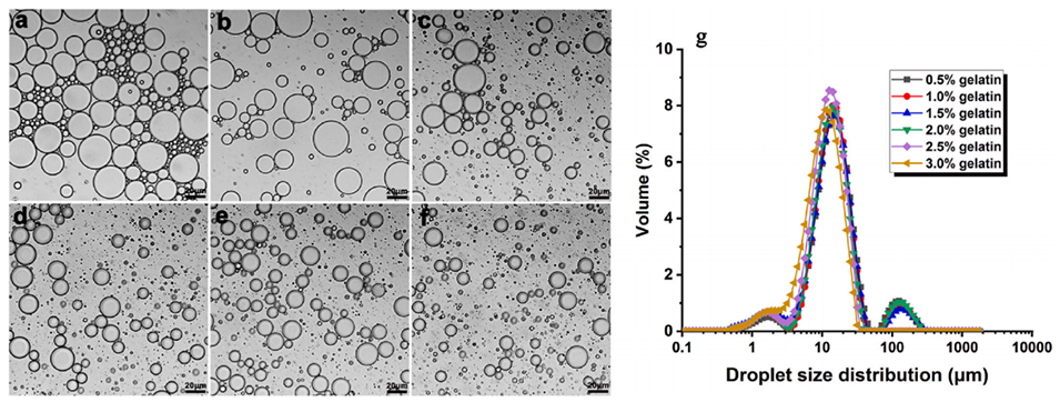 图1. 展示了不同明胶浓度稳定的新鲜水包油(O/W)乳液的代表性光学显微镜图像(a–f)及液滴尺寸分布(g)。其中,(a)为0.5wt%、(b)为1wt%、(c)为1.5wt%、(d)为2wt%、(e)为2.5wt%、(f)为3wt%。比例尺为20μm。