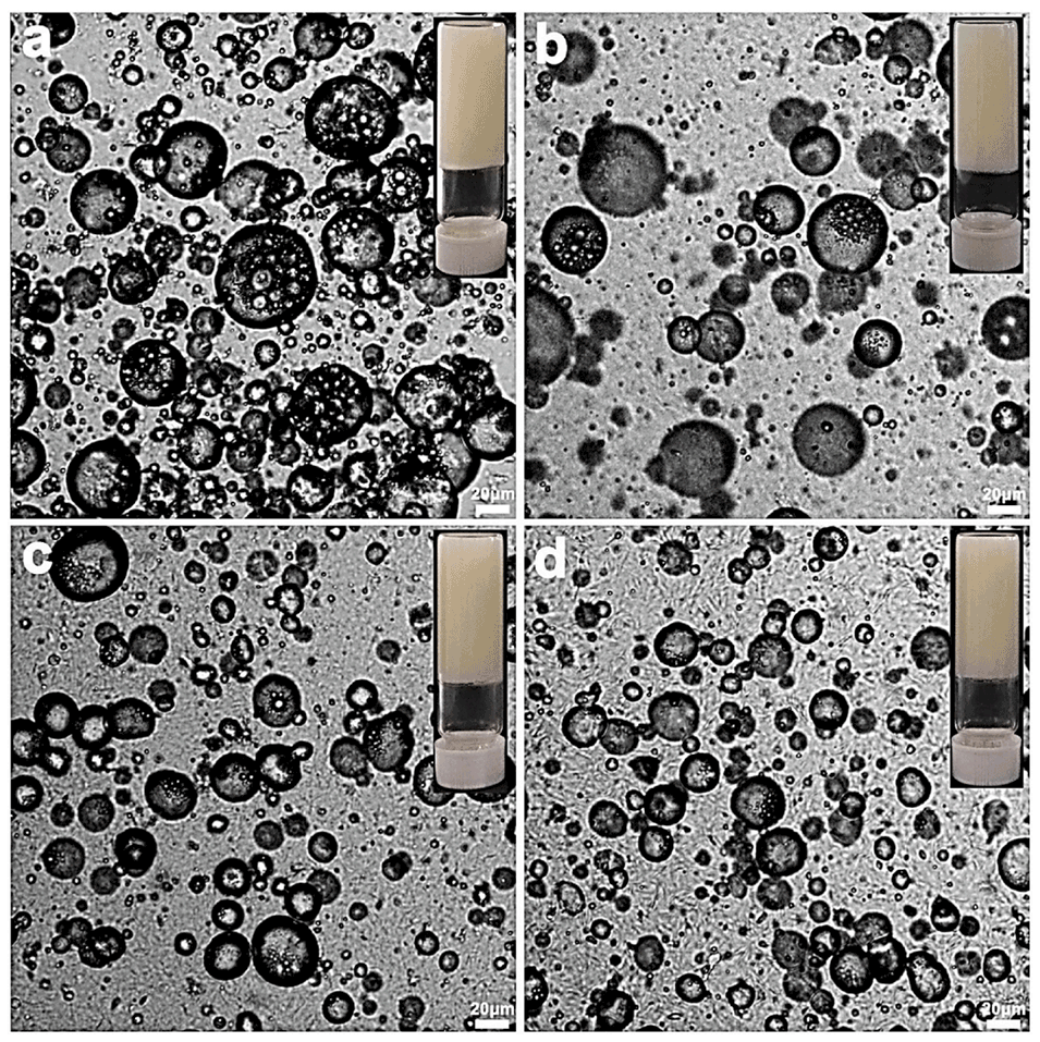 图7. 不同O/W乳液体积分数的O/W/O双重乳液经60℃加热3分钟并冷却至室温后的光学显微镜图像及宏观外观图。(a)10%(v/v)、(b)25%(v/v)、(c)40%(v/v)、(d)55%(v/v)。蜂蜡含量为6wt%。比例尺为20μm。