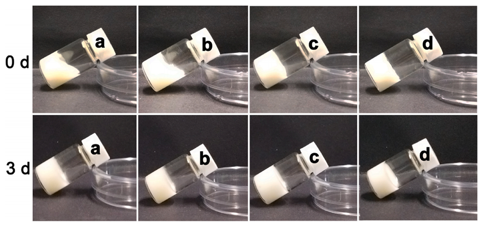 图9. 不同O/W乳液体积分数的O/W/O双重乳液在室温下放置3天后的外观图。(a)10%(v/v)、(b)25%(v/v)、(c)40%(v/v)、(d)55%(v/v)。蜂蜡含量为6wt%。