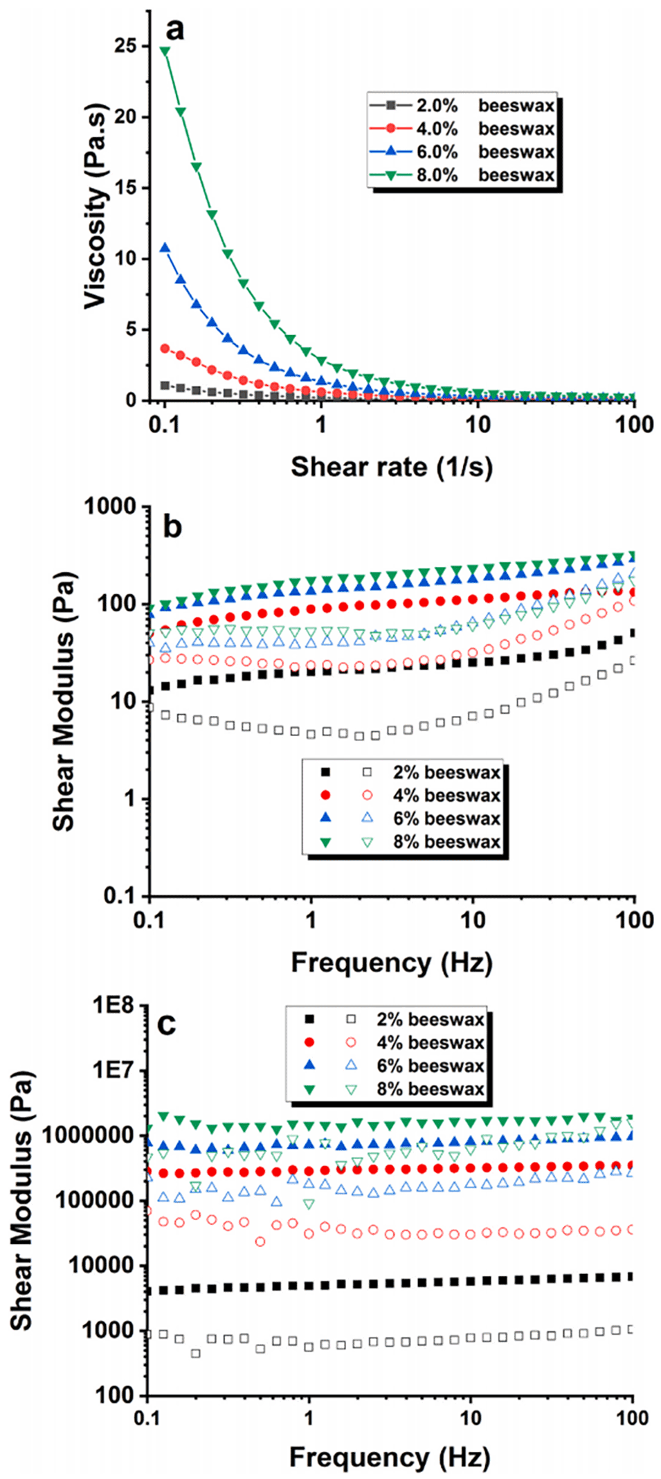 图13. 不同蜂蜡含量稳定的O/W/O双乳液流变特性图。