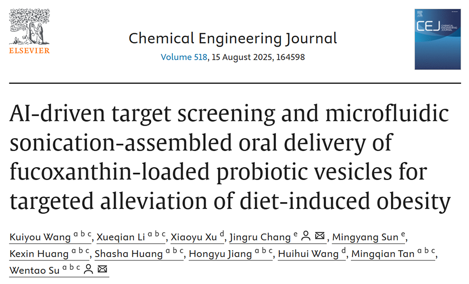 近期,大连工业大学食品学院苏文涛教授团队创新性结合AI驱动靶点筛选与微流控超声技术,成功构建载岩藻黄素的乳酸杆菌来源细胞外囊泡口服递送系统(LCEV@Fx),系统验证了其在调控脂质代谢、缓解饮食诱导肥胖及改善肝脂肪变性方面的显著效果与作用机制。相关研究以“AI-driven target screening and microfluidic sonication-assembled oral delivery of fucoxanthin-loaded probiotic vesicles for targeted alleviation of diet-induced obesity”为题目,发表在期刊《Chemical Engineering Journal》上。