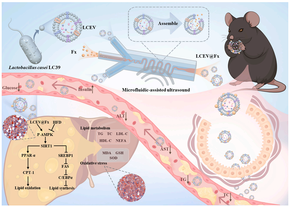图1. 基于益生菌来源胞外囊泡(PDEVs)与微流控芯片辅助超声技术的口服递送系统,用于高效负载与递送岩藻黄素(Fx)以提升其生物利用度。LCEV@Fx 经肠道吸收后进入血液循环并在肝脏蓄积,通过抑制脂质合成、促进脂质氧化调控脂质代谢,进而纠正高脂饮食(HFD)诱导的脂质代谢紊乱,有效缓解相关代谢疾病。