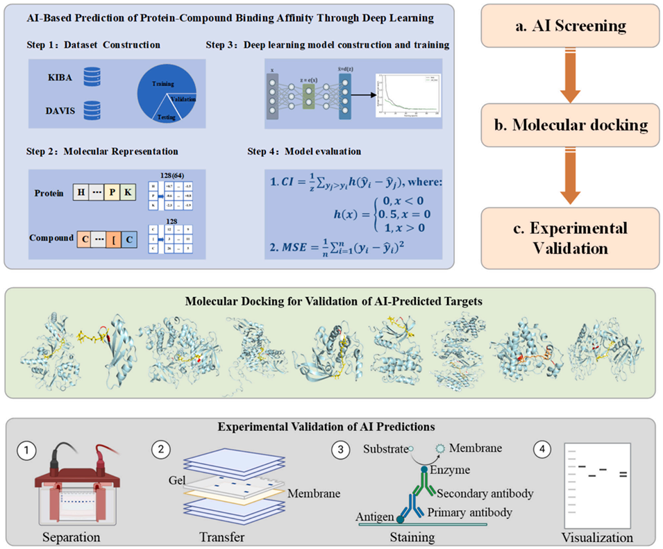 图2. 基于人工智能(AI)的蛋白质-配体结合亲和力预测流程。该流程包括构建 KIBA 与 DAVIS 数据集、对蛋白质(以 FASTA 格式)和小分子(以 SMILES 格式)进行分子表征、训练深度学习模型以预测结合亲和力,模型评估采用均方误差(MSE)与一致性指数(CI)。通过 AI 筛选确定高潜力靶点后,进行分子对接模拟以评估结合模式与结合能,最后对结果进行实验验证。