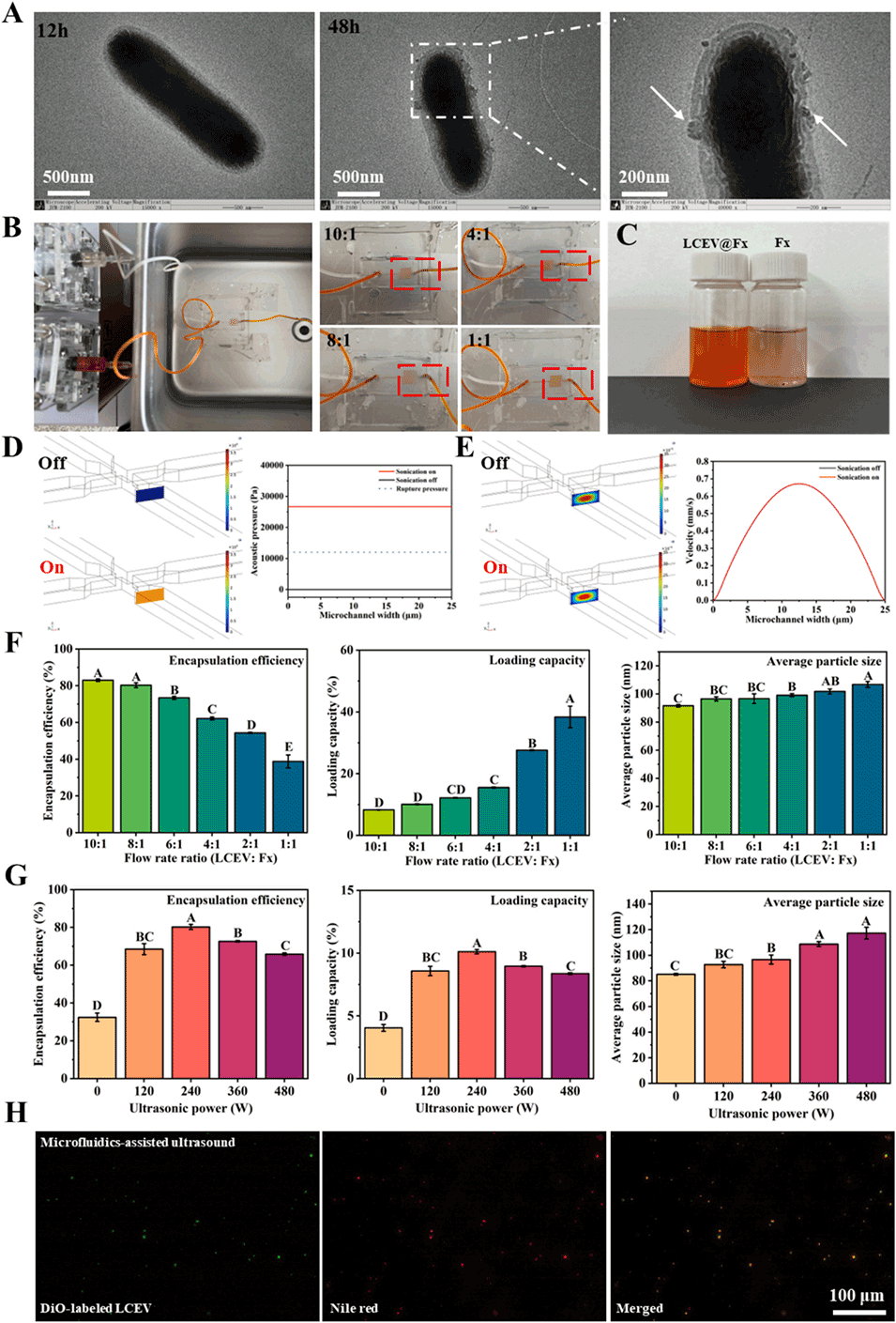 图3. 微流控超声组装载岩藻黄素(Fx)乳酸杆菌来源胞外囊泡(LCEV@Fx)的参数优化与表征。(A)干酪乳杆菌 LC39 培养 12 小时和 48 小时的透射电子显微镜(TEM)图像及局部放大图;(B)微流控芯片辅助超声的操作装置及不同流速比下的内部运行情况;(C)载 Fx 的 LCEV 与游离 Fx 的外观对比;(D)微通道内有无超声时的声压分布模拟;(E)微通道内流体速度场变化模拟;(F)不同流速比对包封率、负载量及平均粒径的影响;(G)不同超声功率对包封率、负载量及平均粒径的影响;(H)荧光素(DIO)标记的 LCEV 与尼罗红(替代 Fx)的共定位图像。不同字母表示差异显著(p<0.05)。