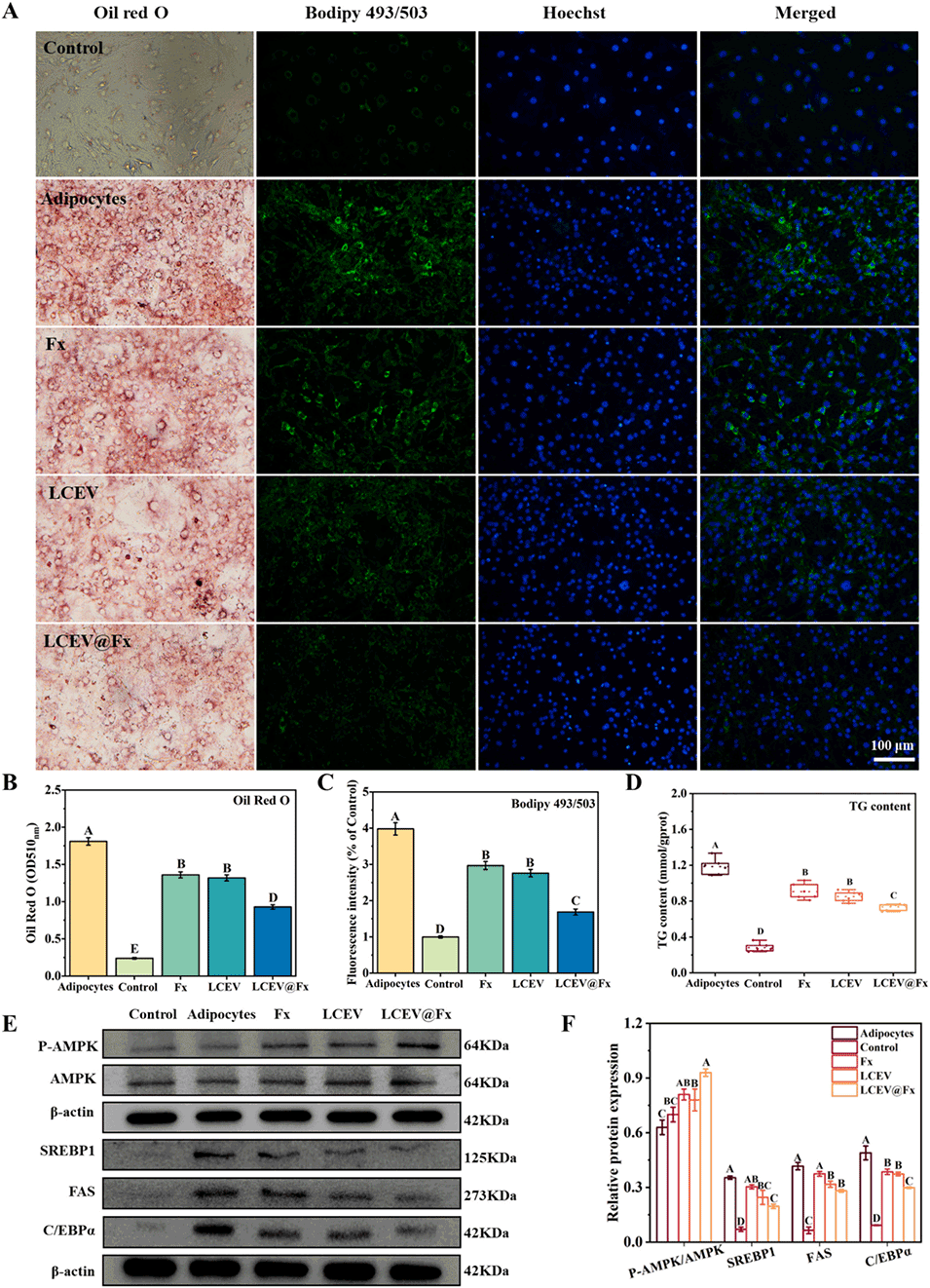 图7. LCEV@Fx 对 3T3-L1 前脂肪细胞分化过程中脂质堆积与成脂的影响。(A)油红 O 与 Bodipy 493/503 染色显示不同处理组脂质堆积的代表性图像;(B)油红 O 染色后通过光密度(OD)值定量分析脂质堆积;(C)Bodipy 493/503 荧光强度定量分析;(D)不同处理组甘油三酯(TG)含量分析;(E)蛋白质印迹分析(Western blot)检测磷酸化腺苷酸活化蛋白激酶(p-AMPK)/AMPK、固醇调节元件结合蛋白 1(SREBP1)、脂肪酸合成酶(FAS)及 CCAAT 增强子结合蛋白 α(C/EBPα)的蛋白表达水平;(F)蛋白表达水平的定量分析。不同字母表示差异显著(p<0.05)。