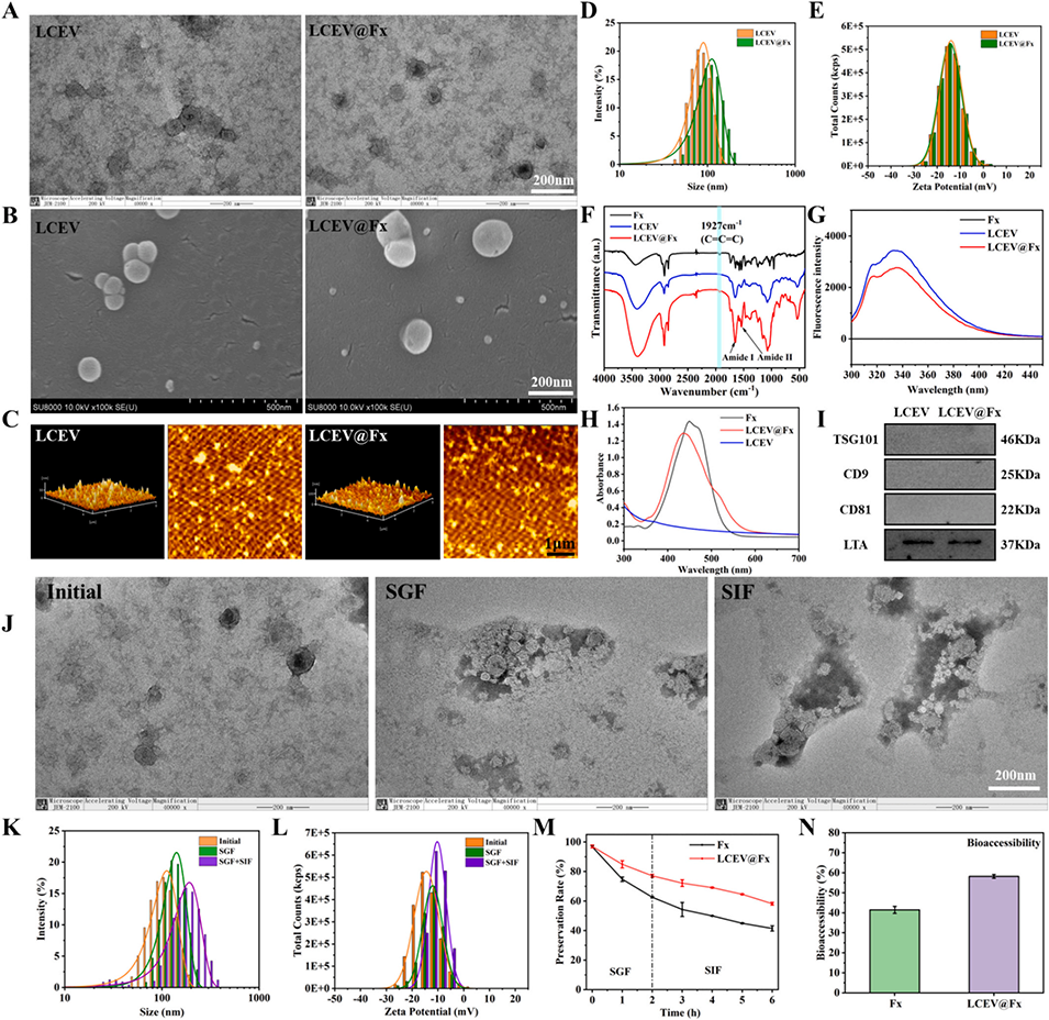 图4. LCEV@Fx 的表征与稳定性分析。(A)LCEV 负载 Fx 前后的透射电子显微镜(TEM)图像;(B)冷冻场发射扫描电子显微镜(Cryo-SEM)图像;(C)原子力显微镜(AFM)图像;(D)粒径分布;(E)zeta 电位分布;(F)傅里叶变换红外光谱(FTIR);(G)荧光光谱;(H)紫外-可见吸收光谱(UV-Vis);(I)蛋白质印迹分析(Western blot)。(J)模拟消化过程中 LCEV@Fx 的 TEM 图像;(K)模拟消化过程中 LCEV@Fx 的粒径分布;(L)模拟消化过程中 LCEV@Fx 的 zeta 电位分布;(M)模拟消化不同时间点 LCEV@Fx 与游离 Fx 的保留率;(N)LCEV@Fx 模拟消化前后的生物可及性。