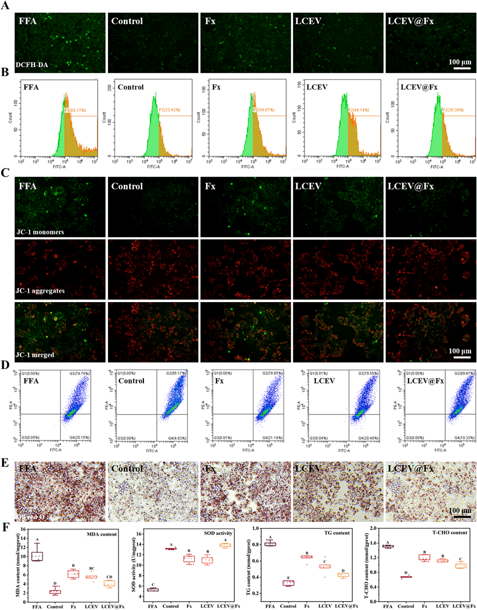 图6. LCEV@Fx 对游离脂肪酸(FFA)诱导的 HepG2 细胞氧化应激与脂质堆积的调控作用。(A)2,7-二氯荧光素二乙酸酯(DCFH-DA)染色检测细胞内活性氧(ROS)水平的代表性图像;(B)流式细胞术定量分析细胞内 ROS 变化;(C)JC-1 染色评估线粒体膜电位变化(区分单体与聚集体荧光信号);(D)流式细胞术定量分析线粒体膜电位变化;(E)油红 O 染色评估细胞内脂质堆积;(F)丙二醛(MDA)含量、超氧化物歧化酶(SOD)活性、甘油三酯(TG)及总胆固醇(T-CHO)水平的定量分析。不同字母表示差异显著(p<0.05)。