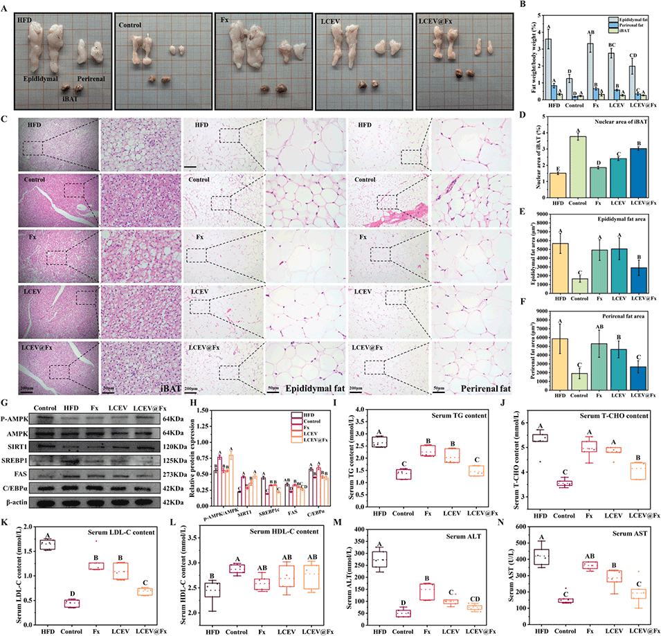 图9. LCEV@Fx 对高脂饮食(HFD)喂养小鼠脂肪组织及血清脂质代谢指标的影响。(A)不同处理组小鼠脂肪组织(附睾脂肪、肾周脂肪、棕色脂肪组织)的代表性图像;(B)不同脂肪组织重量占体重的百分比;(C)脂肪组织的苏木精-伊红(H&E)染色代表性图像;(D)肩胛间棕色脂肪组织(iBAT)中细胞核面积占比的定量分析;(E)肾周脂肪面积定量分析;(F)附睾脂肪面积定量分析。(G)蛋白质印迹分析(Western blot)检测脂质代谢相关通路蛋白(p-AMPK/AMPK、沉默信息调节因子 1(SIRT1)、SREBP1、FAS、C/EBPα)的表达水平;(H)蛋白表达水平的相对定量分析。(I)小鼠血清甘油三酯(TG)水平;(J)血清总胆固醇(T-CHO)水平;(K)血清低密度脂蛋白胆固醇(LDL-C)水平;(L)血清高密度脂蛋白胆固醇(HDL-C)水平;(M)血清天冬氨酸转氨酶(AST)水平;(N)血清丙氨酸转氨酶(ALT)水平。不同字母表示差异显著(p<0.05)。