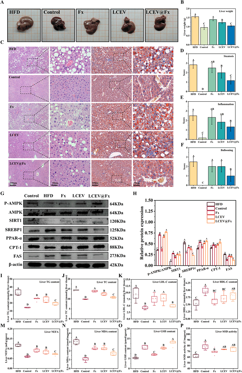 图10. LCEV@Fx 对高脂饮食(HFD)喂养小鼠肝脏脂质代谢与氧化应激的影响。(A)不同处理组小鼠肝脏外观代表性图像;(B)肝脏重量;(C)肝脏苏木精-伊红(H&E)染色与油红 O 染色代表性图像;(D)肝脏脂肪变性评分;(E)肝脏炎症评分;(F)肝脏气球样变评分。(G)蛋白质印迹分析(Western blot)检测 p-AMPK/AMPK、SIRT1、固醇调节元件结合蛋白 1c(SREBP1c)、过氧化物酶体增殖物激活受体 α(PPAR-α)、肉碱棕榈酰转移酶 1(CPT-1)及 FAS 的蛋白表达水平;(H)蛋白表达水平的相对定量分析。(I)肝脏甘油三酯(TG)水平;(J)肝脏总胆固醇(T-CHO)水平;(K)肝脏低密度脂蛋白胆固醇(LDL-C)水平;(L)肝脏高密度脂蛋白胆固醇(HDL-C)水平;(M)肝脏非酯化脂肪酸(NEFA)水平;(N)肝脏丙二醛(MDA)水平;(O)肝脏还原型谷胱甘肽(GSH)水平;(P)肝脏超氧化物歧化酶(SOD)活性。不同字母表示差异显著(p<0.05)。