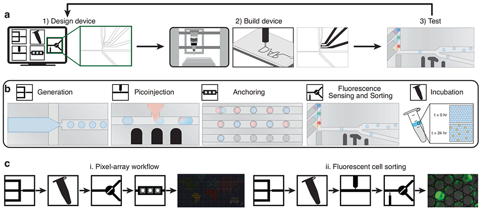 在此背景下,波士顿大学研究团队开发了一套基于桌面微铣削和导电墨水电极的低成本、快速原型化液滴微流控组件库,可实现液滴生成、再注入、锚定、皮升级注入、荧光传感和分选等功能,并通过组装这些组件构建液滴“像素”阵列,成功演示了复杂多步工作流程,为生物和化学领域的高通量筛选等应用提供了经济高效的解决方案。相关研究以“Component library creation and pixel array generation with micromilled droplet microfluidics”为题目,发表于期刊《Microsystems & Nanoengineering》。