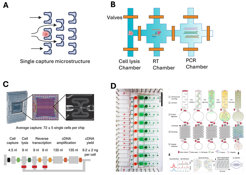 图3. 用于单细胞组学研究的流体动力控制装置。(A)用于单细胞捕获与分离的微结构示意图。(B)由微型阀门构建的隔离反应室示意图:在阀门系统的精准控制下,细胞裂解、逆转录及聚合酶链式反应(PCR)可在隔离反应室内依次进行。(C)商用流体动力控制装置(HFCD)——Fluidigm C1:该装置可用于高灵敏度单细胞转录组研究,通过单细胞捕获结构与阀门系统,实现单细胞裂解、逆转录、扩增及 cDNA 文库构建。(D)用于单细胞蛋白质组研究的流体动力控制装置:该装置可实现全自动操作,包括细胞分离、计数、成像、芯片上细胞裂解、蛋白质消化、肽段制备,以及微量蛋白质的鉴定与定量。