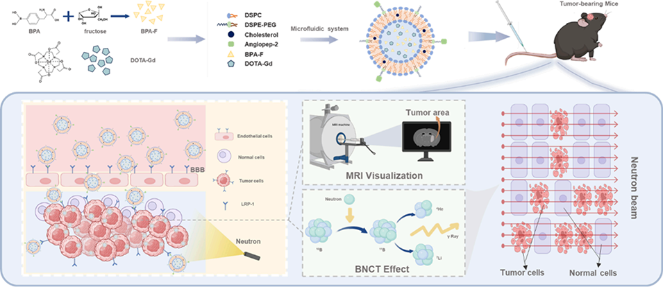 2、该载体通过微流控系统共装载临床常用硼药BPA-F和MRI造影剂DOTA-Gd,并修饰Angiopep-2肽以增强血脑屏障穿透及神经胶质瘤靶向能力。