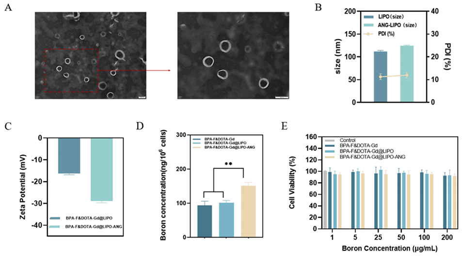 图1.(A)BPA-F&DOTA-Gd@LIPO-ANG 的透射电子显微镜(TEM)图像,比例尺:200 nm;(B)纳米颗粒的平均水合粒径与多分散指数(PDI);(C)纳米颗粒的 zeta 电位;(D)GL261 细胞对 BPA-F&DOTA-Gd、BPA-F&DOTA-Gd@LIPO(非靶向脂质体,简称 LIPO)及 BPA-F&DOTA-Gd@LIPO-ANG(靶向脂质体,简称 ANG-LIPO)的细胞内硼摄取量(**p<0.01);(E)不同药物载体(BPA-F&DOTA-Gd、BPA-F&DOTA-Gd@LIPO、BPA-F&DOTA-Gd@LIPO-ANG)对 GL261 细胞的细胞毒性作用。
