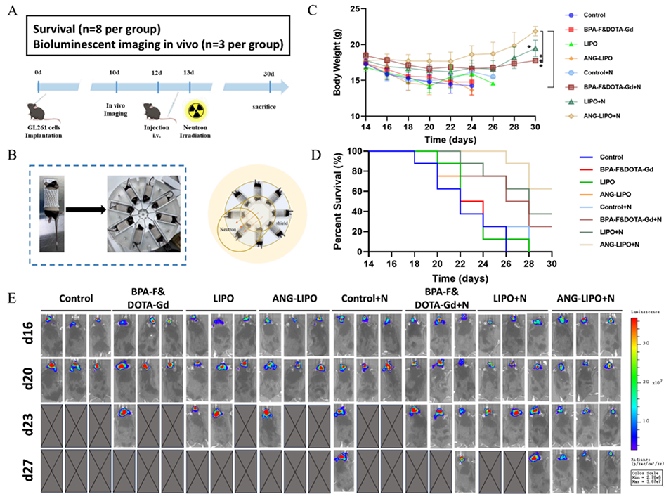 图4.(A)实验设计示意图(给药剂量为 2.5 mg/kg,注射后 6 小时进行照射);(B)GL261 原位胶质瘤荷瘤小鼠的 BNCT 照射示意图(标注照射部位与防护方案);(C)各组小鼠体重变化曲线(样本量 n=8,*p<0.05,**p<0.01,***p<0.001);(D)各组小鼠存活曲线(样本量 n=8):对照组(Control)存活至第 26 天,BPA-F&DOTA-Gd 组存活至第 26 天,LIPO 组存活至第 28 天,ANG-LIPO 组存活至第 26 天,对照 + 照射组(Control+N)存活至第 26 天,BPA-F&DOTA-Gd + 照射组(BPA-F&DOTA-Gd+N)存活至第 26 天,LIPO + 照射组(LIPO+N)存活至第 28 天,ANG-LIPO + 照射组(ANG-LIPO+N)存活至第 26 天;(E)所有处理组的代表性 IVIS 光谱成像图(直观展示肿瘤生长情况)。