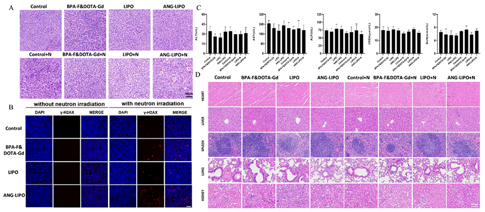 图5.(A)肿瘤组织的苏木精-伊红(H&E)染色结果,比例尺:50 μm;其中 LIPO 指 BPA-F&DOTA-Gd@LIPO(非靶向脂质体),ANG-LIPO 指 BPA-F&DOTA-Gd@ANG-LIPO(靶向脂质体);(B)肿瘤组织的 γ-H2AX 免疫荧光检测结果,比例尺:50 μm;(C)各组小鼠血液生化指标(反映肝肾功能,样本量 n=8);(D)通过 H&E 染色评估各组小鼠器官毒性,比例尺:100 μm(检测器官包括心、肝、脾、肺、肾,验证载体安全性)。
