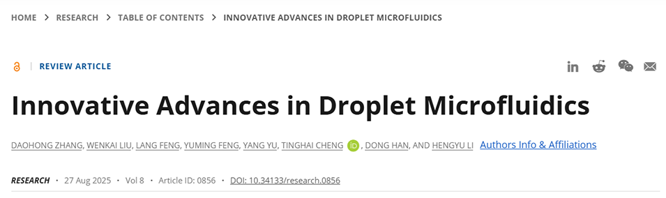 近期,中国科学院北京纳米能源与系统研究所程廷海研究员、李恒禹副研究员联合浙江大学韩冬研究员发表综述,系统梳理了液滴微流控技术的液滴生成、操控与检测核心环节,深入探讨其在单细胞分析、3D细胞培养、药物研发及疾病防治等生物医学领域的应用价值,并剖析当前技术挑战与未来发展方向。相关研究成果以“Innovative Advances in Droplet Microfluidics”为题目发表于期刊《Research》。