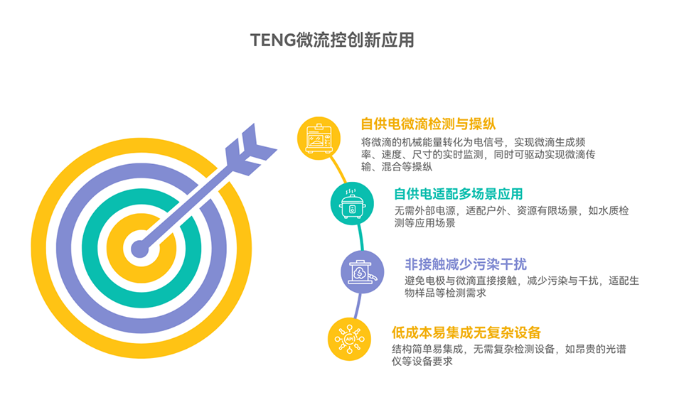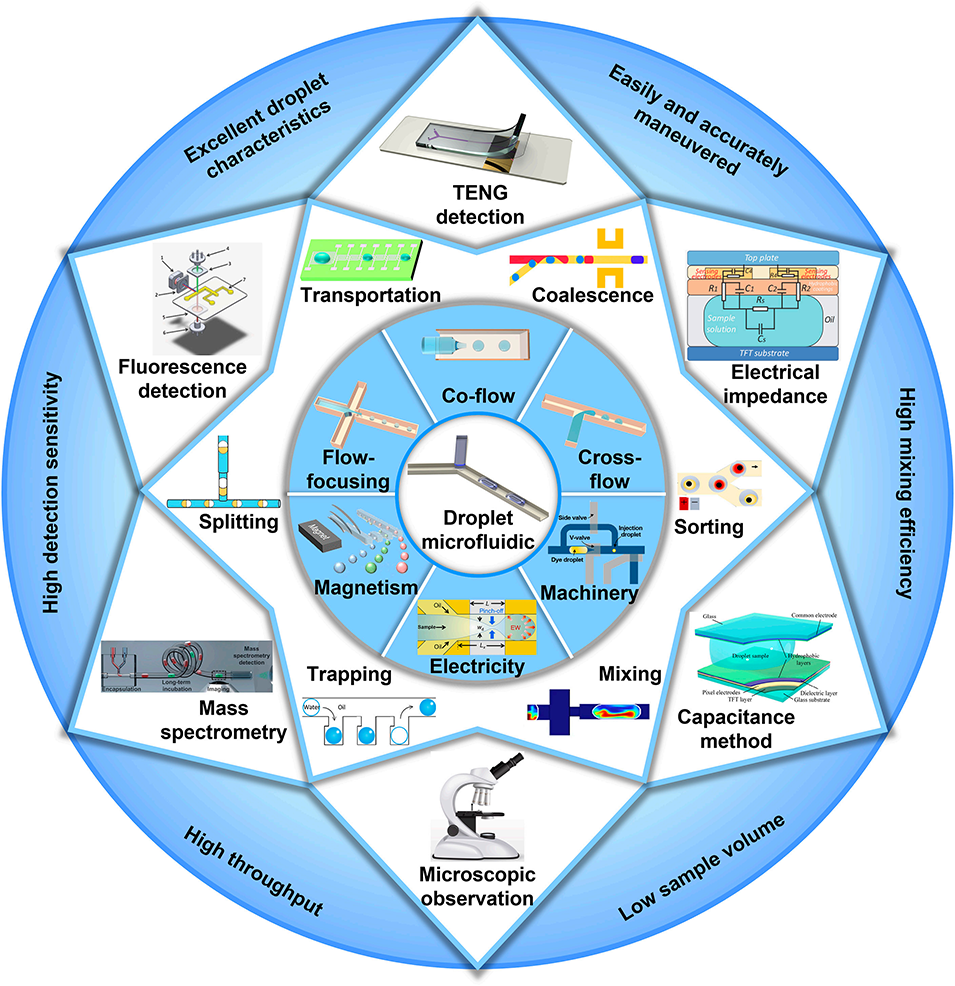 1、系统综述了液滴的生成、操控与检测方法,包括被动与主动生成策略、多种物理场操控技术,以及光学、质谱、电学和基于摩擦纳米发电机(TENG)的检测手段。