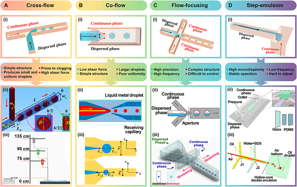 图2: 被动生成方法。展示了四种主要的被动液滴生成技术:A. 交错流:包括基本的T型结、带颈缩结构的T型结以及重力驱动的高通量生成系统。B. 共流:采用同轴通道,利用连续相对分散相的剪切力生成液滴,适用于双乳液液滴。C. 流动聚焦:连续相从两侧挤压分散相,可产生高度均一的微小液滴。D. 阶梯乳化:利用通道突然扩张的几何结构,依靠界面张力驱动液滴断裂,单分散性极佳。