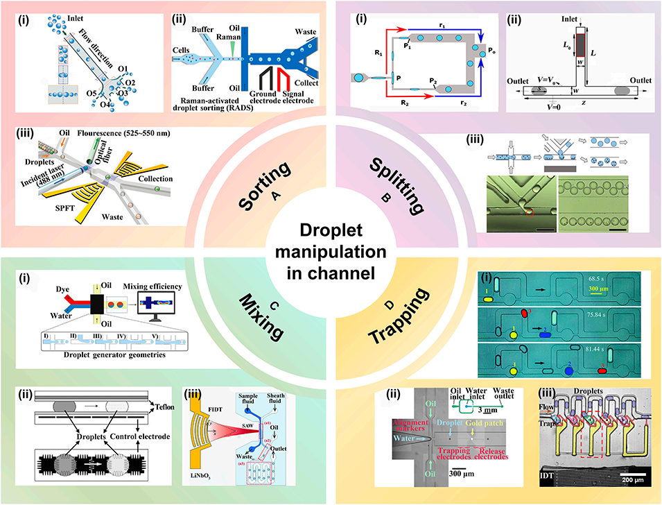 图4: 芯片内的液滴操控。展示了在微流控通道内对液滴进行的多种操作:A. 分选:基于惯性、介电泳或声场等原理将液滴引导至不同路径。B. 分裂:通过拉伸通道结构、不对称电场或磁场将液滴一分为二。C. 混合:采用特殊交叉结构、电润湿或声流效应促进液滴内试剂混合。D. 捕获:利用气泡、电润湿电极或声波产生的气泡将液滴固定在特定位置。